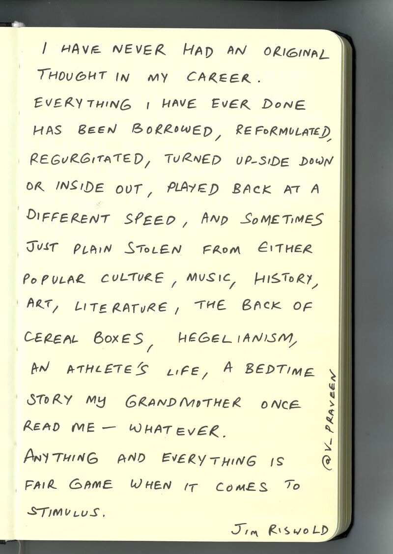 » Praveen Vaidyanathan shared this from Jim Risworld on originality. The irony of me posting an image from someone else, who wrote down a quote from someone else, is not lost on me.
