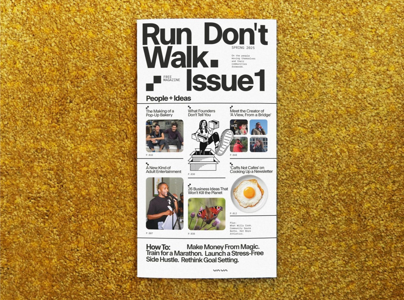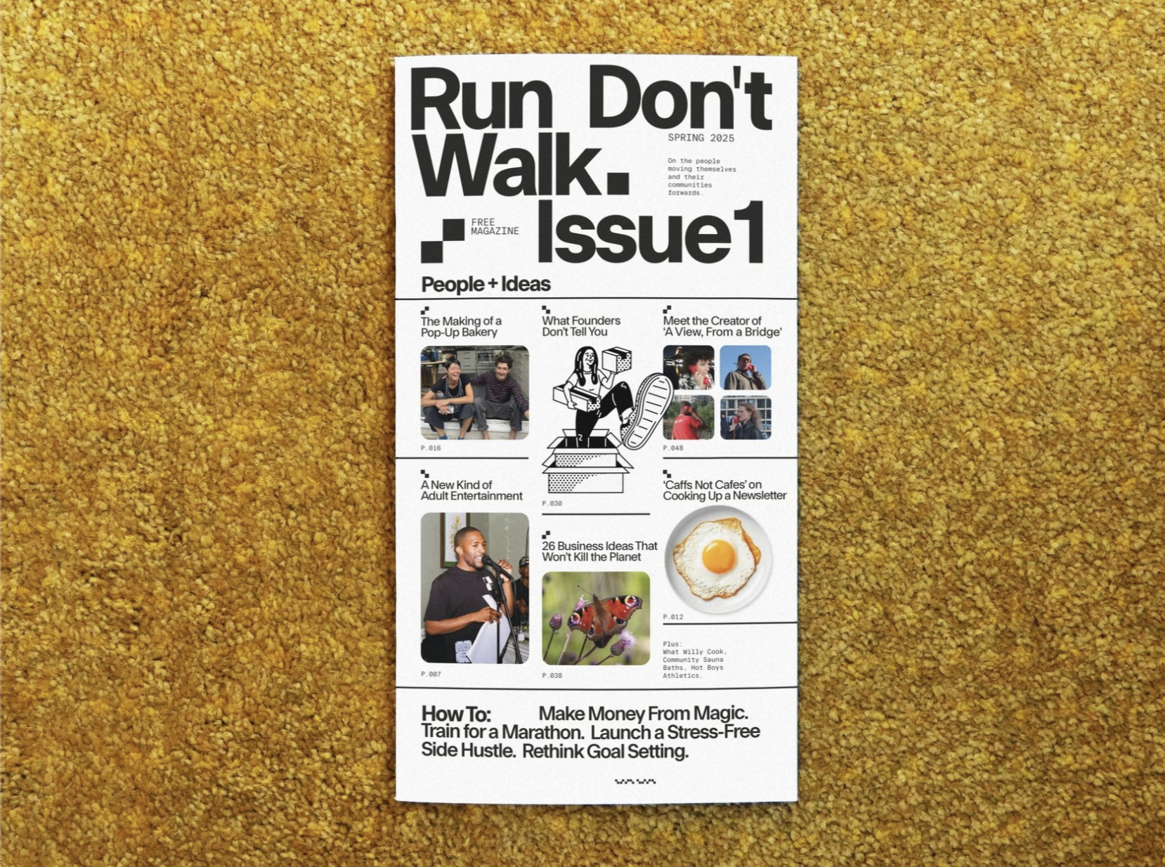 A. We're a platform all about celebrating people who are doing things differently - whether they're starting a business, creating a new product, or building a community. We want to share their stories to inspire others and show that they can do it too. So the goal is to encourage people to take action - whether that means finally launching that business they’ve been talking about forever, getting involved with a local community project, or signing up for that writing course they've always wanted to do. The name 'Run Don't Walk' was a way to sum it up - as in, don’t overthink it, have some fun and go for it.